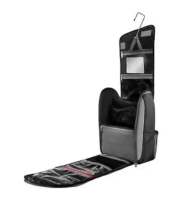 Bolso para baño con muchos bolsillos y compartimentos para guardar y colocar todo lo que necesitamos para nuestro aseo en cualquier lugar, con practico gancho para colgar y espejo incorporado.