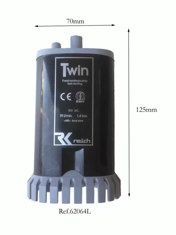 Bomba de agua sumergida de la marca Reich modelo Twin , esta bomba es muy montada en autocaravanas Hymer, dispone de doble cuerpo con un caudal de 19L/min y 1.4bar.