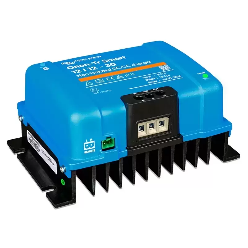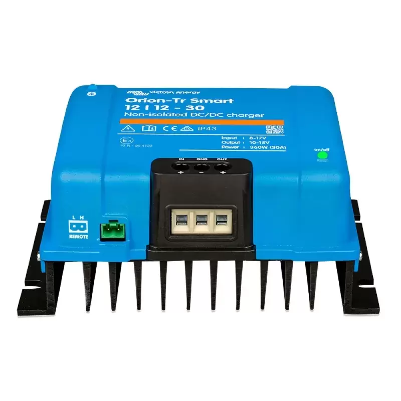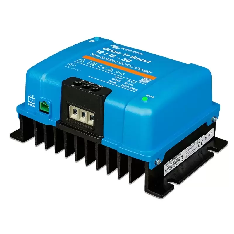 Para su uso en sistemas duales de batería en vehículos o embarcaciones en los que el alternador y la batería de arranque se utilizan para cargar la batería de servicio. La unidad puede monitorizarse y programarse vía Bluetooth y se puede controlar a distancia mediante un interruptor on/off remoto. El cargador Orion-Tr Smart puede usarse en sistemas de 12 ó 24 V y es adecuado tanto para baterías de plomo-ácido como de litio. Hay modelos disponibles de hasta 400 W y se puede conectar un número ilimitado de unidades en paralelo para incrementar la potencia de salida.
