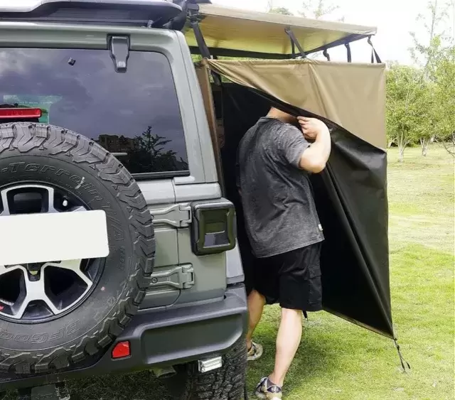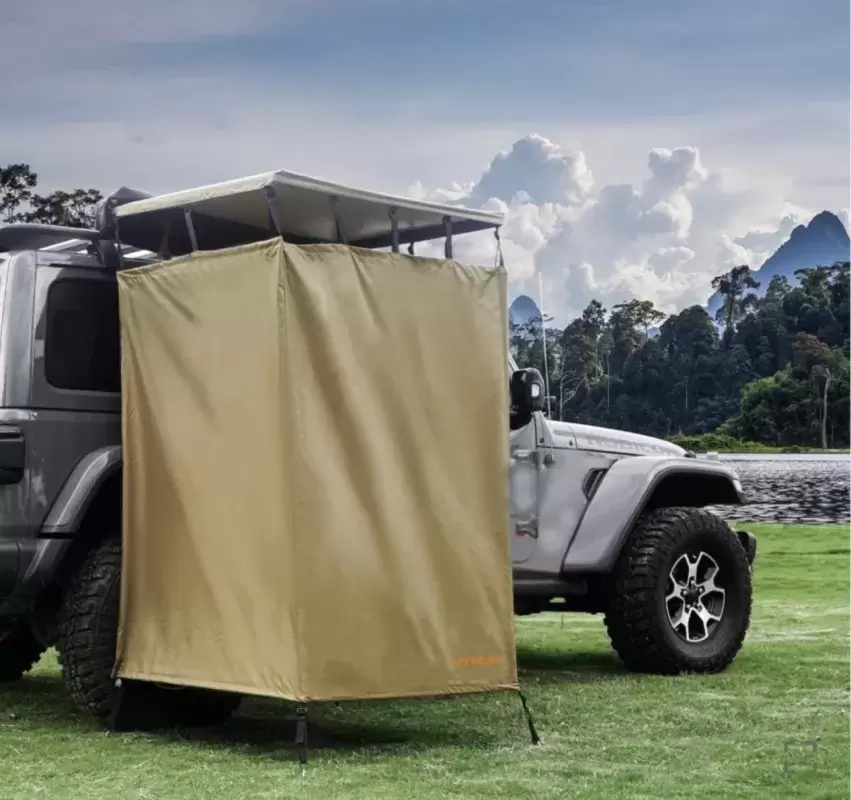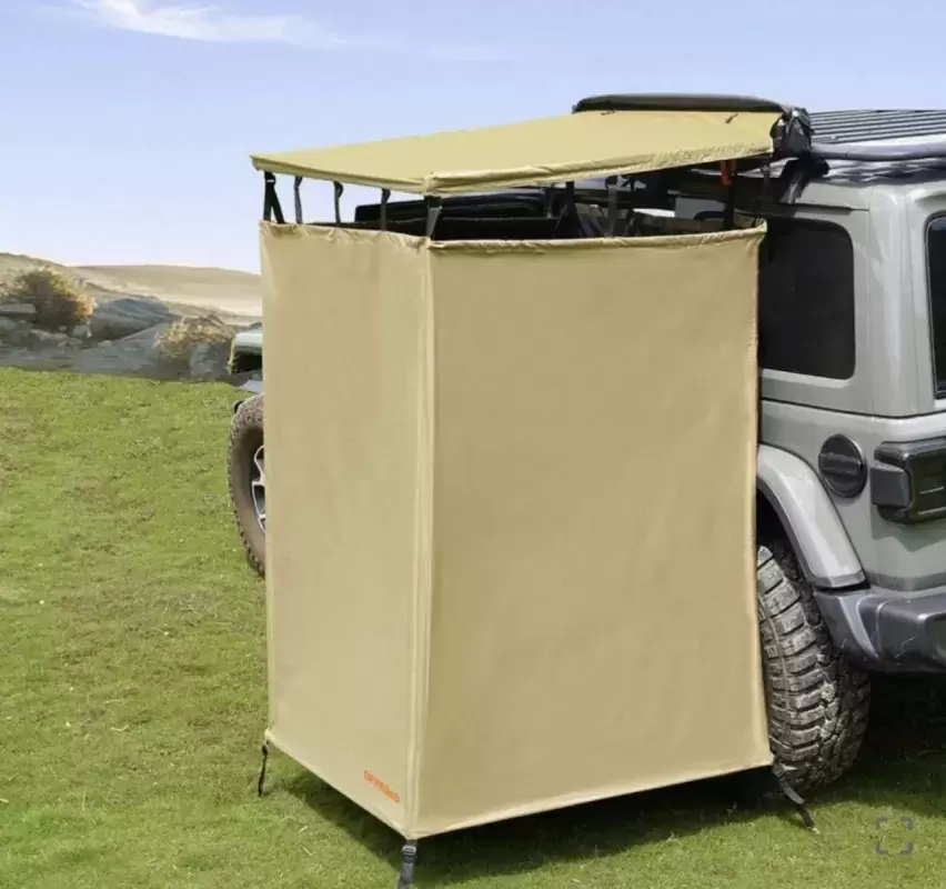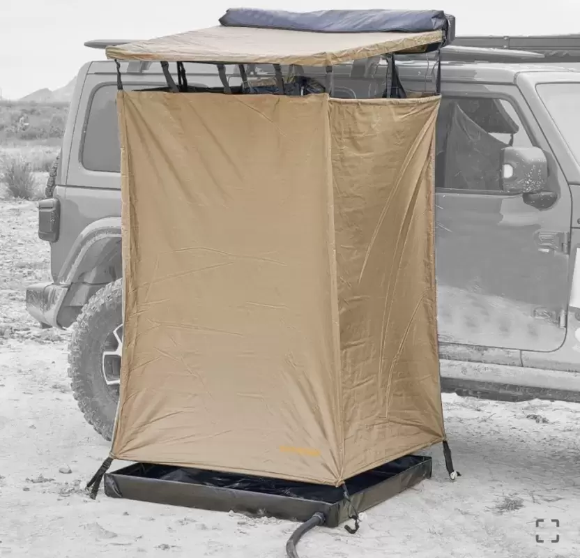 Nuevo concepto de ducha Pórtatil plegable tipo toldo lateral ideal para vehículos camper y 4x4 overland.