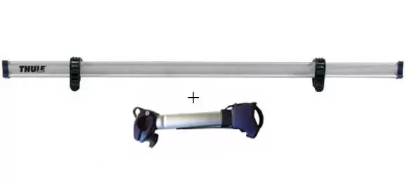 El kit se compone de carril Thule de aluminio, protecciones plásticas para soportes, correas plásticas para fijar ruedas, terminales, un brazo de sujección de 28cm y la tornilleria necesaria.