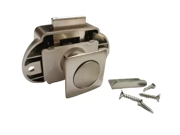 Cierre pulsador cuadrado con roseta y mecanismo, color níquel mate