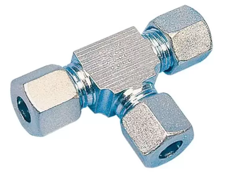 Conector en T para tuberias de gas de 8mm con casquillo conico de sellado integrado.