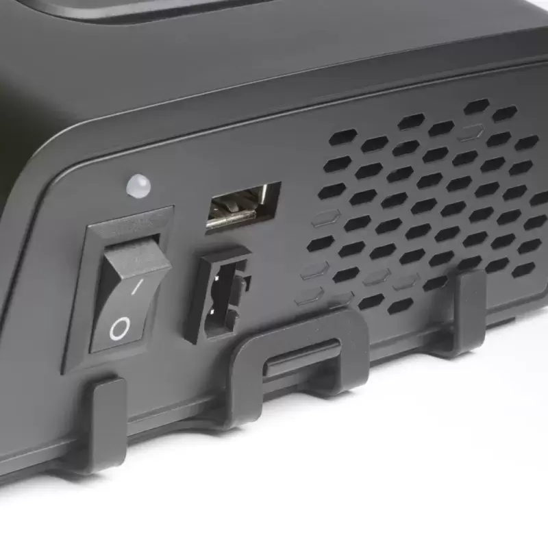 Este convertidor senoidal diseñado para convertir la alimentación eléctrica de 12 V a 230 V CA puros garantiza un funcionamiento fiable de los aparatos de baja potencia (hasta 350 W) con la batería del vehículo.