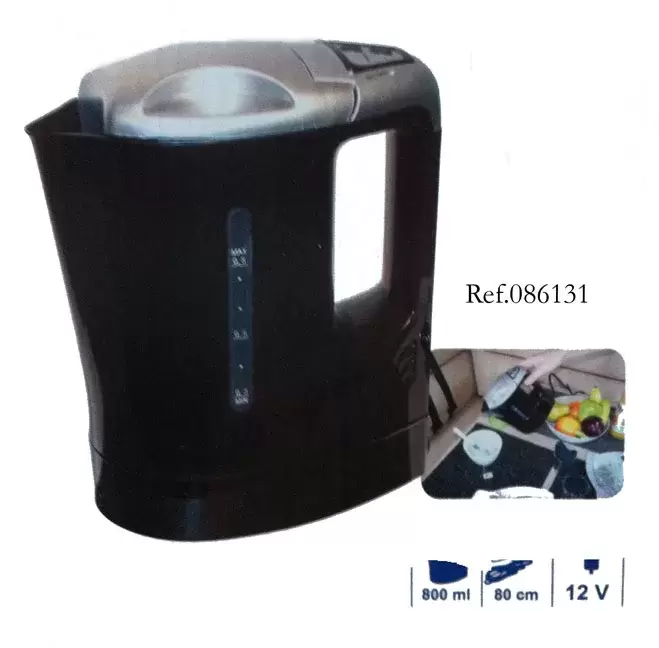 Hervidor de agua 12v que se apaga automáticamente al empezar a hervir. Protección contra sobrecalentamiento por fusible integrado. Indicador luminoso de funcionamiento.