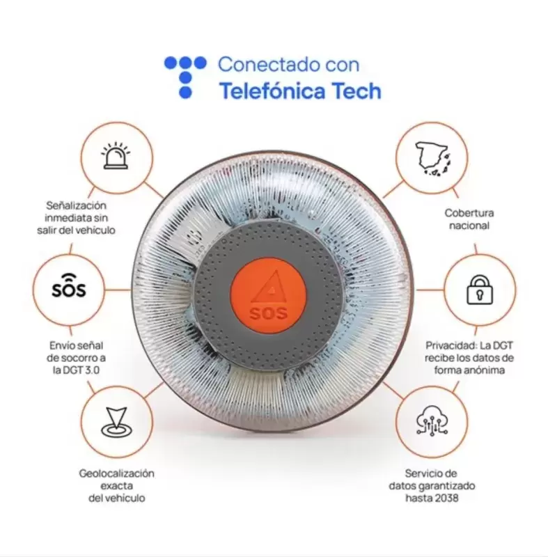 Se trata de una pequeña baliza de color amarillo que está dotada de conectividad y es capaz de emitir una luz 360º de alta intensidad de forma intermitente y continua al menos durante 30 minutos.