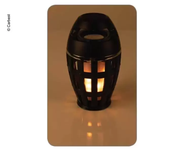 Acogedora luz LED con efecto de llama y altavoz Bluetooth integrado.