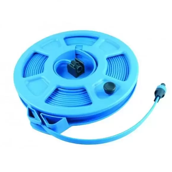 Manguera plana con soporte con tres tubos flexibles , puede utilizarse incluso completamente enrrollada. el racor <<Water stop>> le protege de salpicaduras, le permite cambiar de ascesorio escoba de lavado, ducha, deposito de jabon, lanza etc. sin tener que contar el agua. empuñadura amovible para atornillar.
