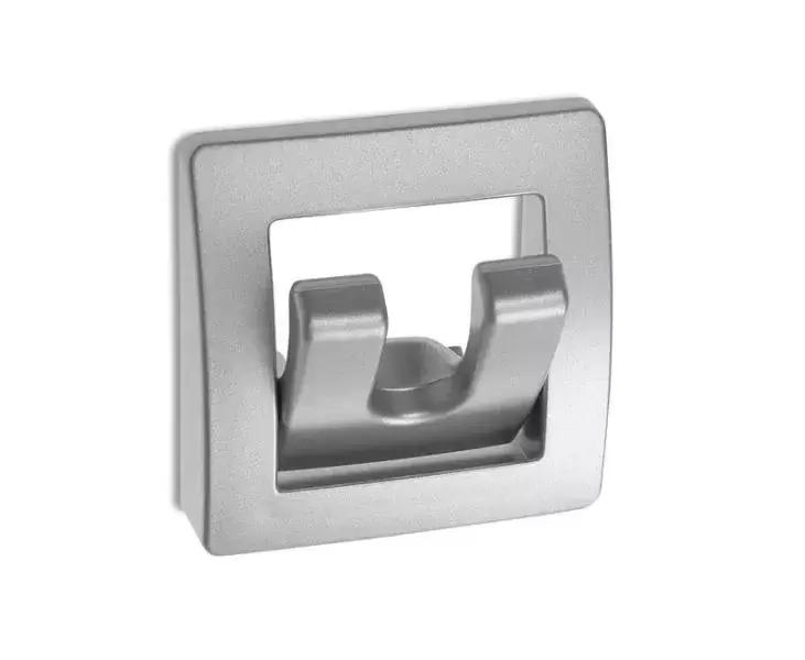 Este gancho plegable de plástico plateado mate convence por su diseño elegante y fácil instalación.