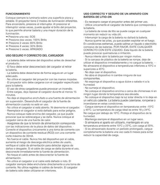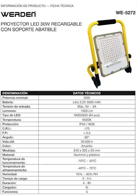 Batería LiFePO4 (Litio) Carga: 3-5 h Duración: 4-8 h Temperatura de color: 6500K