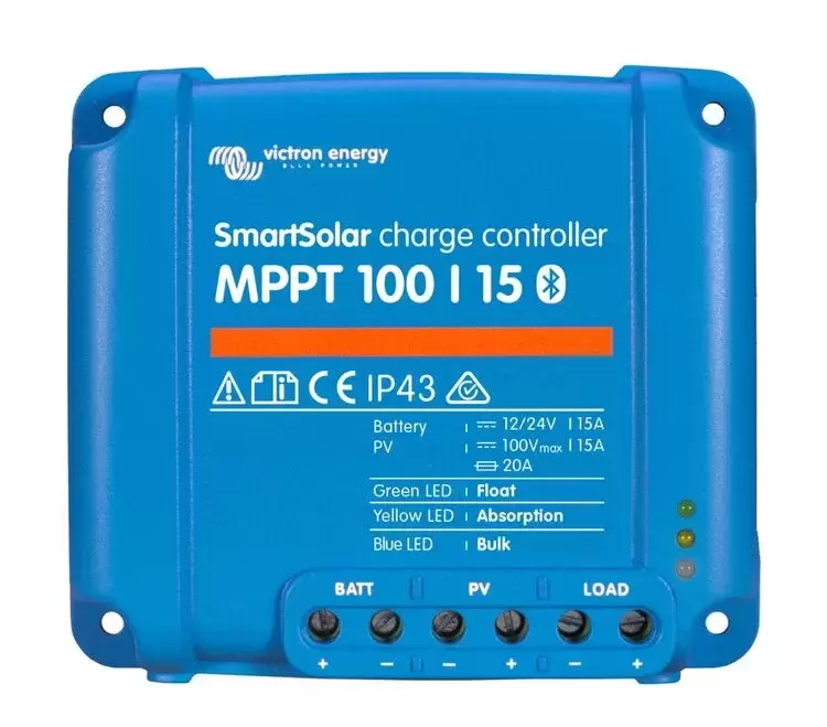 El controlador de carga Smartsolar 100/15 de Victron Energy es un controlador de carga solar MPPT